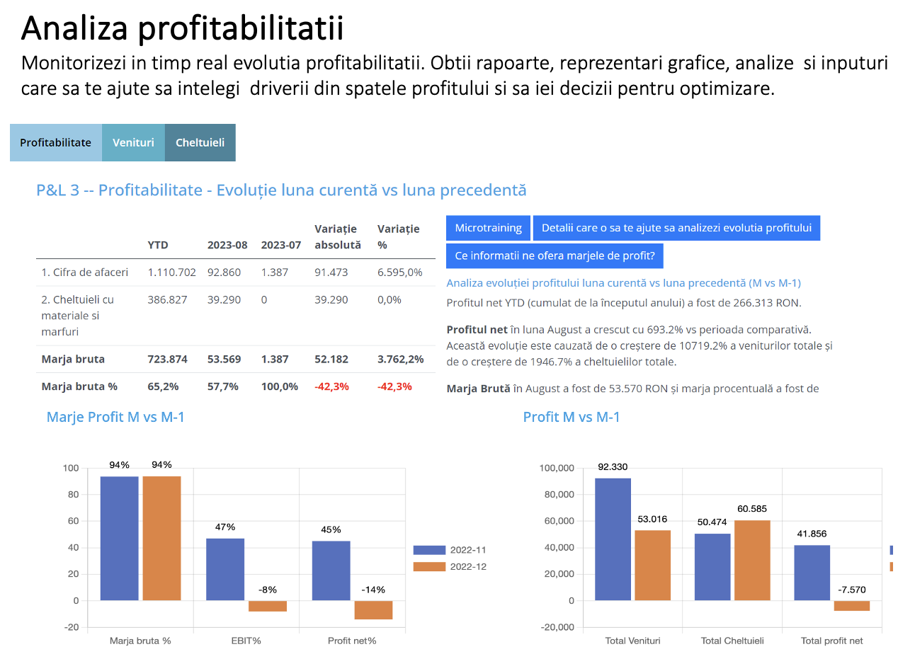 - Identifici usor recomandari si actiuni de optimizare pentru imbunatatirea performantei financiare.
