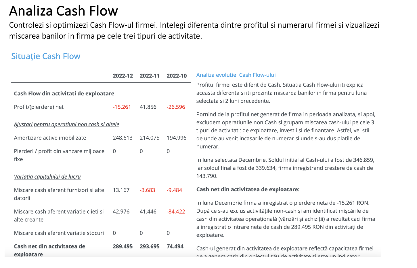 • Monitorizeazi lunar profitabilitatea, situatia financiara si Cash Flow-ul, intelegi cauzele, ai alerte pentru riscuri.